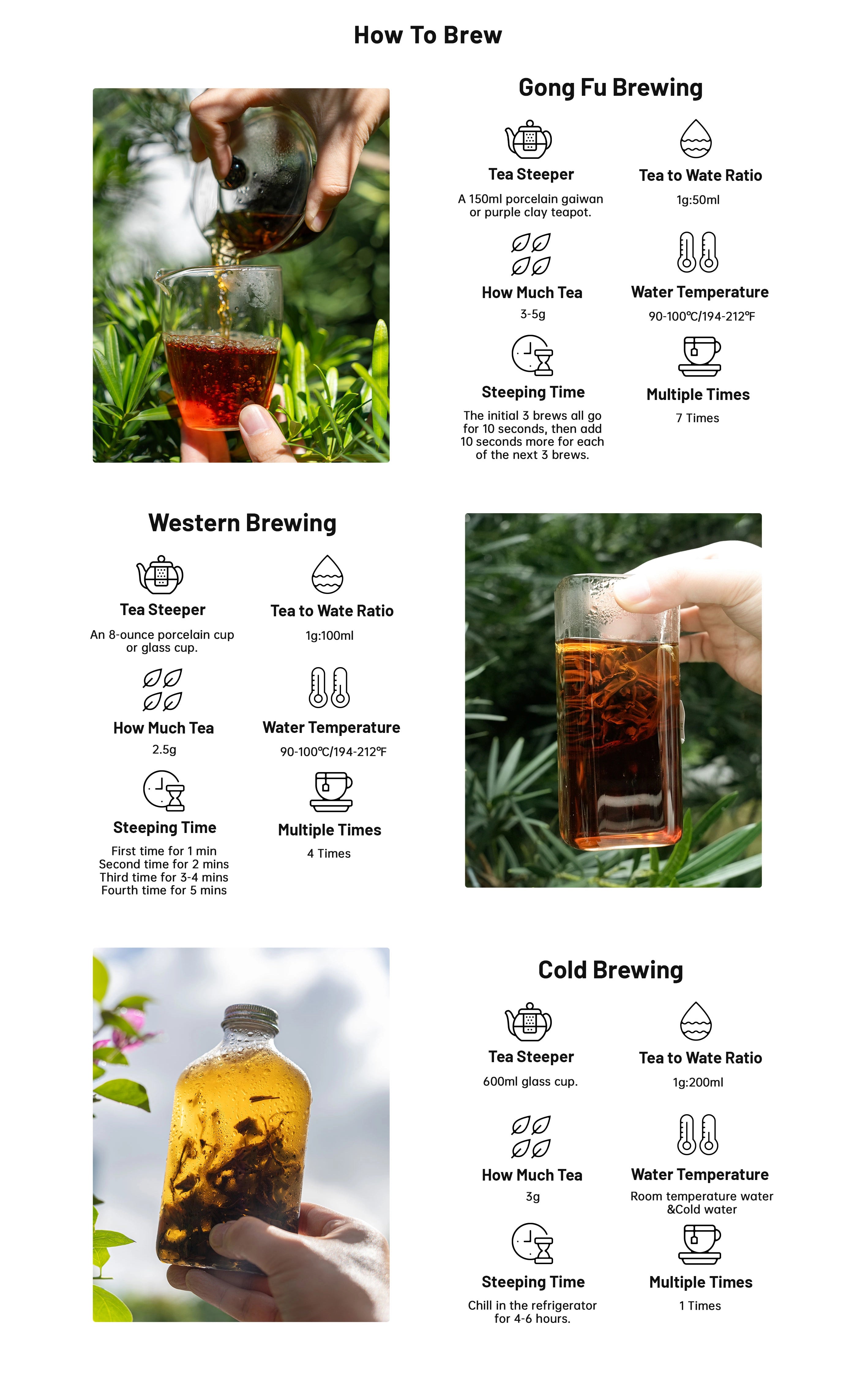 A variety of brewing methods available, including Wester style, Gongfu tea, and cold brew black tea