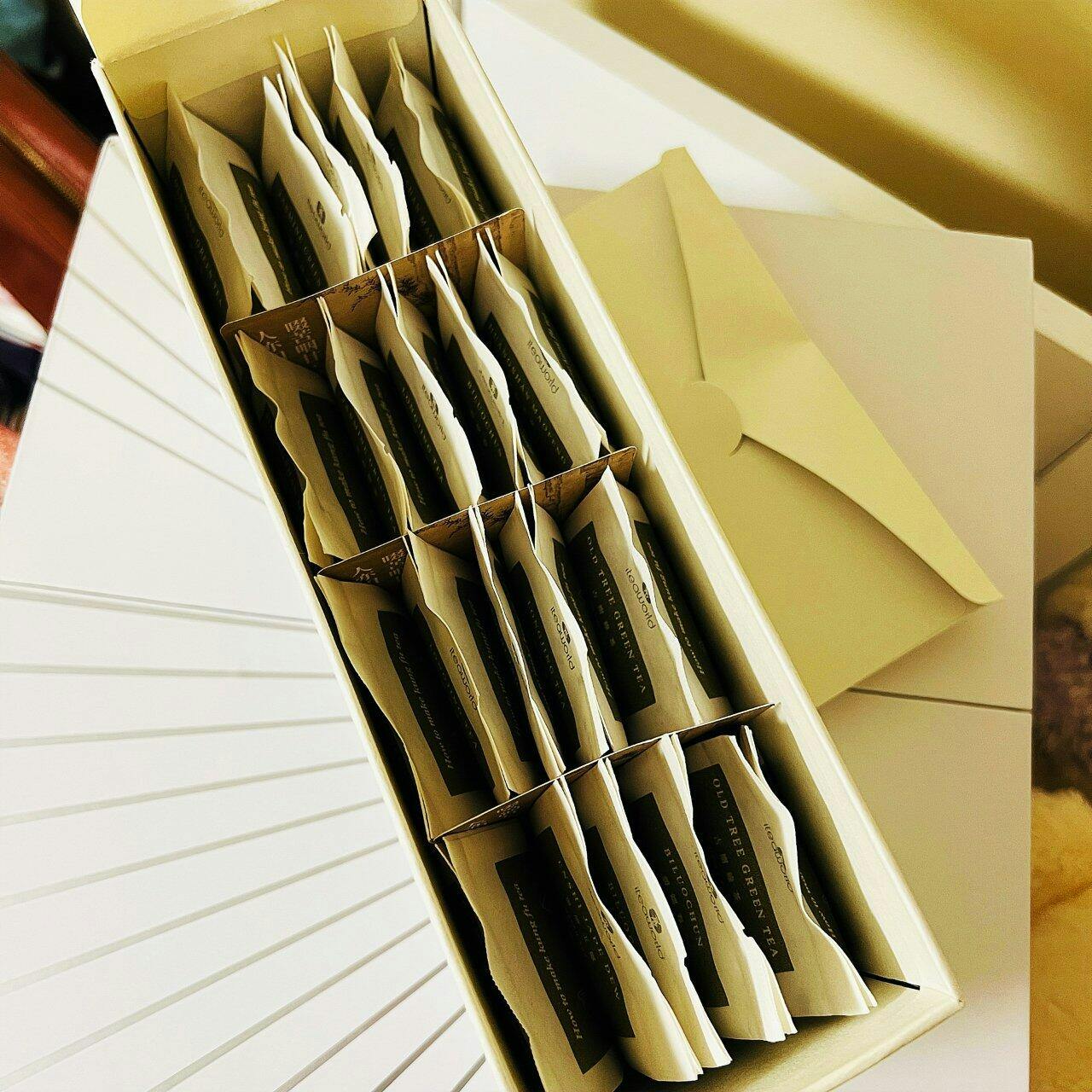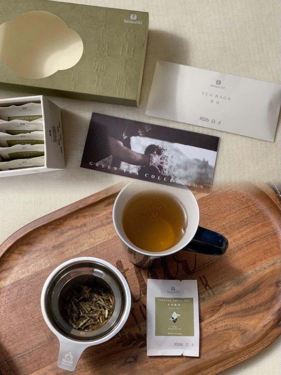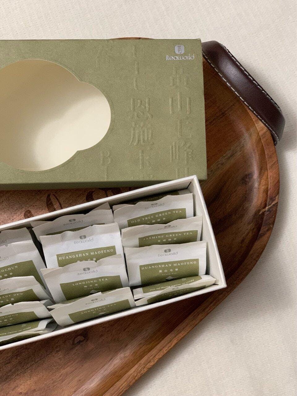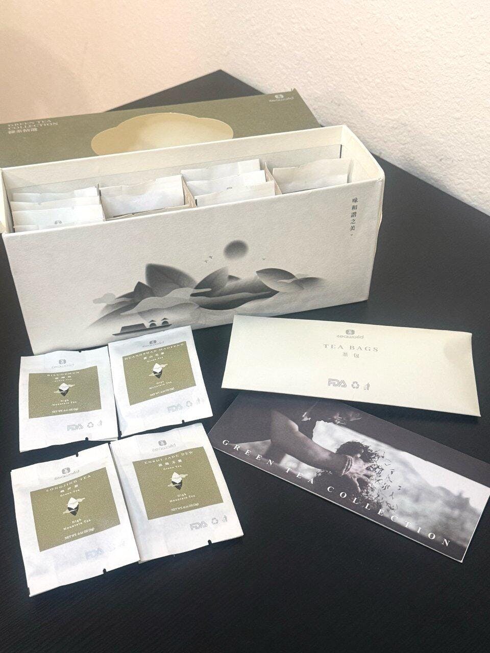 The outer packaging of the green tea collection is biodegradable, the bag for tea leaves will break down at high temperatures.